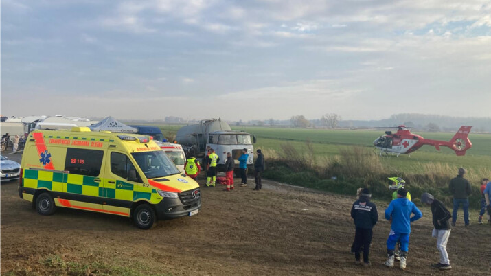 Následující den se stala další havárie v Horní Suché na Karvinsku. Tentokrát se těžce zranil devětačtyřicetiletý muž. Utrpěl život ohrožující poranění hrudníku a zlomeninu klíční kosti. Záchranáři provedli nezbytné zaléčení a zraněného letecky převezli do nemocnice.