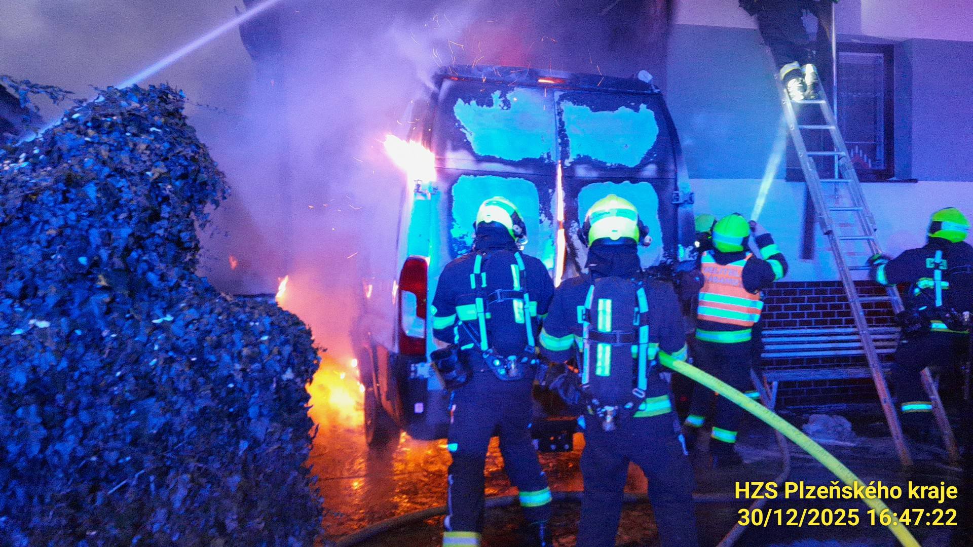 Hasiči v Tlučné na Plzeňsku bojovali s požárem dodávky, zachránili dvě kočky