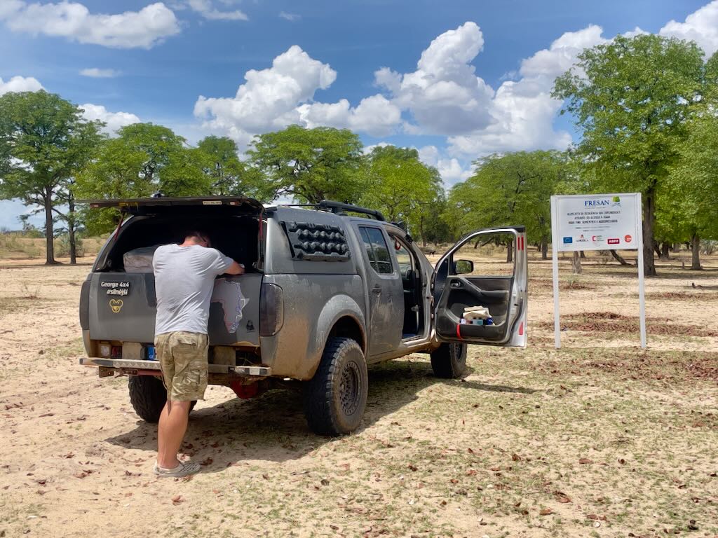 Cesta z Namibie přes Ruacana Falls do Angoly má být vyhlídková a zážitková, což se splní hned na hraničním přechodu, kde nikdo nemluví jinak než portugalsky, objevují se naše české zásuvky (na rozdíl od jihoafrických „kolíků“) a čas se posouvá o hodinu nazpět. Trapnost otázky směřované na celníka, zda se v zemi skutečně jezdí „kontinentálně“ vpravo, se naplno ukáže už po cca 50 metrech, kdy silnice zmizí a plynule přejde do polní cesty, na které potkáme první auto po asi 200 km. Je vlastně nepochopitelné, proč vůbec hraniční přechod existuje, když jej reálně nikdo nevyužívá, protože na angolské straně žijí v zásadě jen příslušníci kmenů, kteří rozhodně záměrně nikam nemigrují. Jejich životní podmínky jsou tak skromné, že si jen těžko představit, že by obydlí postavené z větví, kdy opustili. Tady nemají ani plech a hřebíky. Cesta na hlavní silnici trvá nekonečných 4,5 hodiny, při kterých tu a tam projede proti nám motorka, jež je v zásadě jediným dopravným prostředkem schopným se v rozbláceném terénu pohybovat. Cedule informující o silnici postavené za podpory EU, portugalského kulturního institutu a kohosi dalšího vyvolává otázku, jestli se její výstavba teprve plánuje, nebo zda už postavena oficiálně byla a jen se stavební materiál rozkradl. Těžko říct, každopádně jsem si jista, že povinnou publicitu projektu podpořeného EU tady nikdo v terénu kontrolovat nebude, protože se sem nikdy fyzicky nedostane.