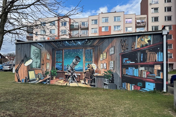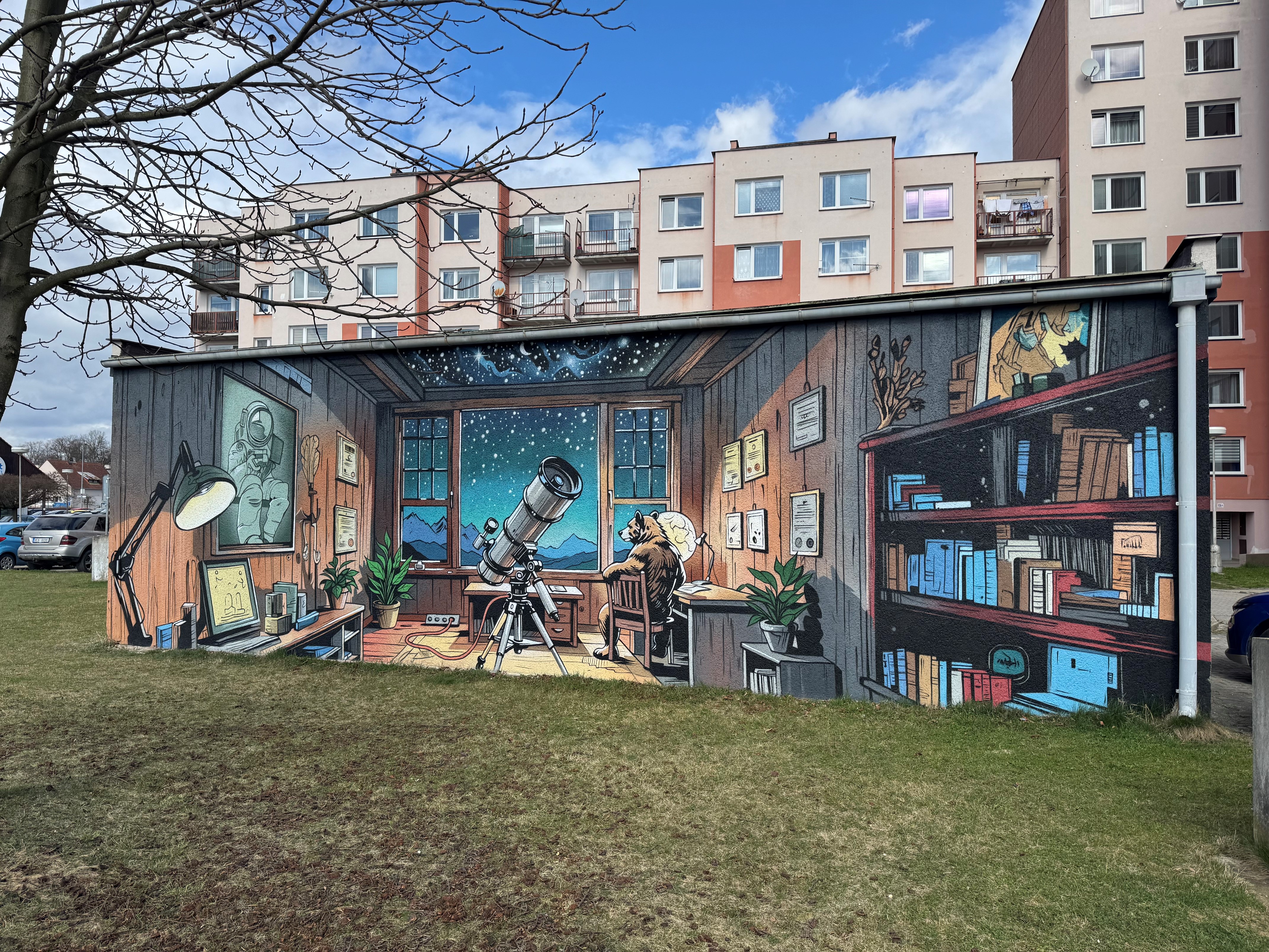 V Plzeňském kraji jich je zatím dokončeno 23 v devíti městech a do konce roku jich bude rovných 30. Nejvíce jsou vidět v krajské metropoli, kde je jich deset a z toho 4 v městské části Plzeň – Doubravka, kde byla „vymalována“ i jedna z posledních. Konkrétně ve Sluneční ulici ji zdobí motiv pingpongové herny s elektrokolem. Další najdeme v ulici Pod vrchem - fotoateliér se sportovním autem, v Těšínské ulici (filmový ateliér s kamerou a siluetou zdatného losa) nebo v Polední ulici - svářečská dílna se skulpturou velké kočky. Před pár dny sprejeři v Horažďovicích u mateřské školy v Mayerově ulici dotáhli motiv observatoře s teleskopem a sedícím medvědem.
