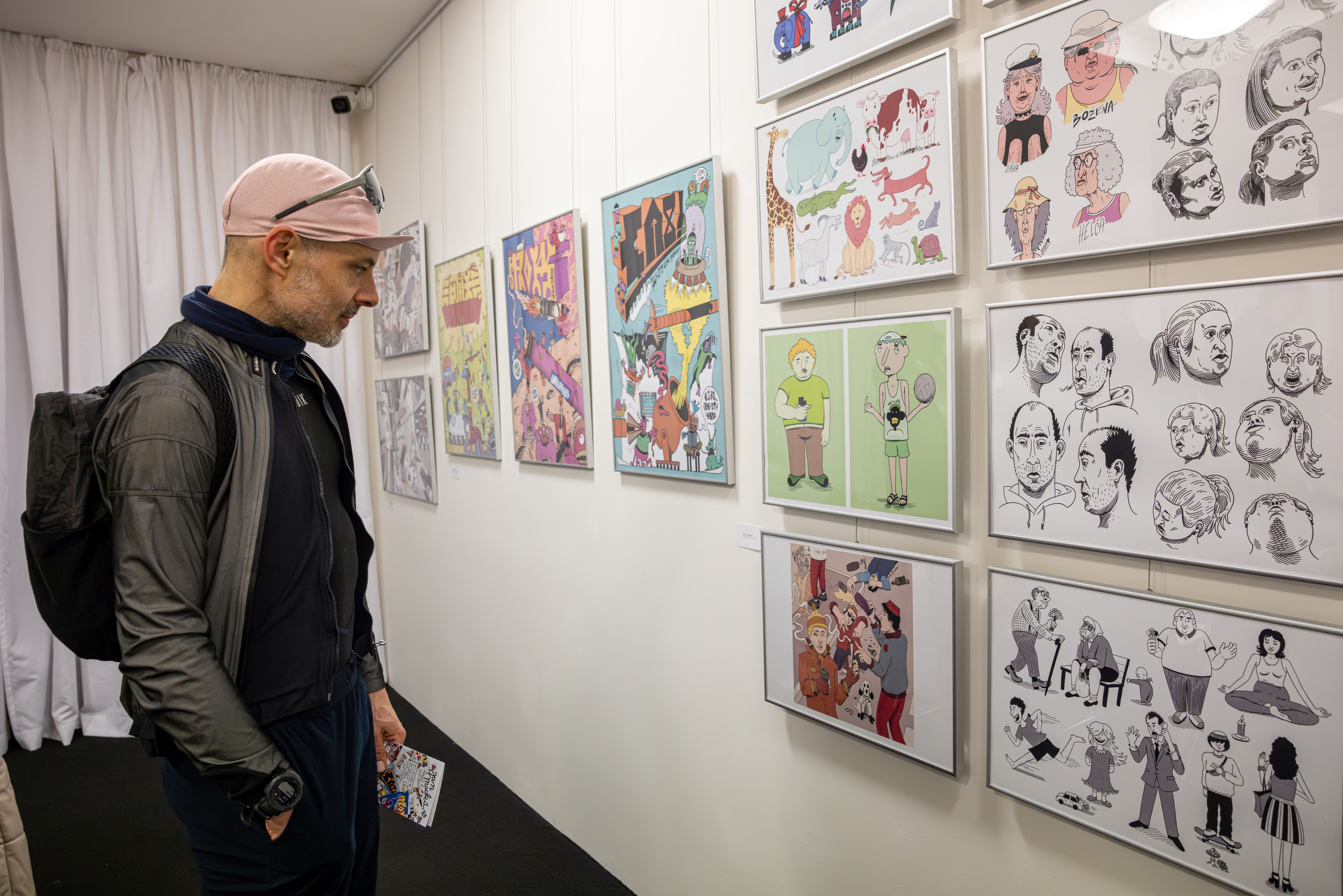 Většina vystavených prací vznikla digitálně; autorský rukopis Jana Macků je charakteristický černou linkou doplněnou šrafurou a plošnou barevností.