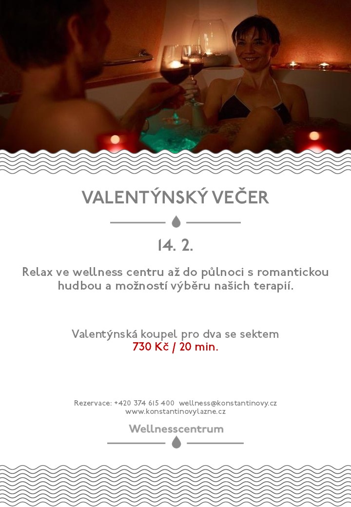 Hledáte dokonalý způsob, jak vyjádřit své city a na chvíli se zastavit v uspěchaném světě? Jako každý rok, i letos ve Wellnesscentru Konstantinovy Lázně pro své návštěvníky připravili nezapomenutelný Valentýnský večer, který proběhne v sobotu 14. února.