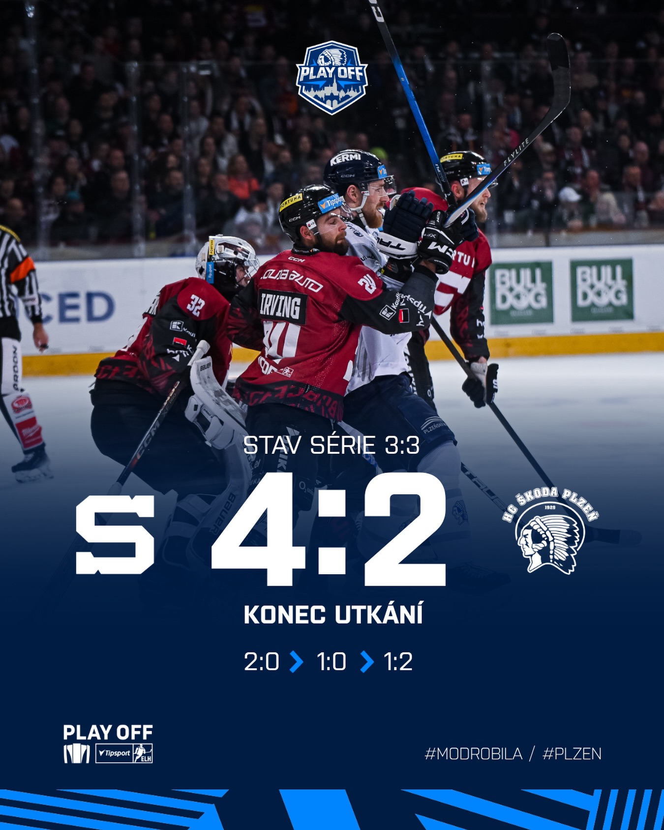 Plzeňští hokejisté v šestém čtvrtfinálovém zápase na ledě Sparty neuspěli a po porážce 2:4 dovolili soupeři srovnat stav série. Škoda doplatila na nepovedený vstup do utkání, kdy inkasovala už po 32 vteřinách, a přestože ve třetí třetině vykřesal naději gólem Lukáš Strnad, domácí si vítězství pohlídali.