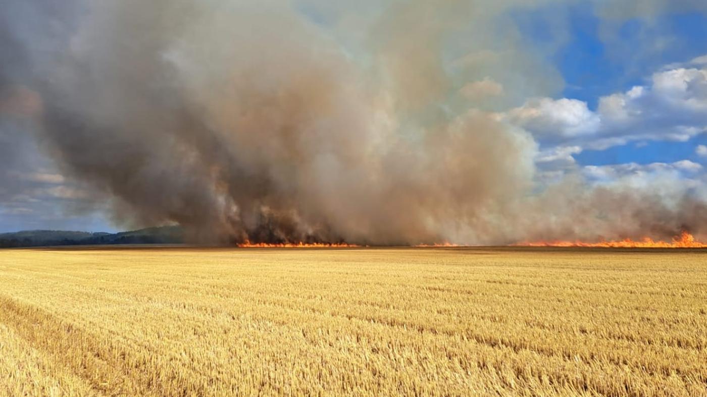 Pravděpodobně jiskra od kombajnu způsobila nedělní požár pole u Dobřan. Škoda se pohybuje kolem 65 tisíc korun. Informoval o tom mluvčí krajských hasičů Petr Poncar.