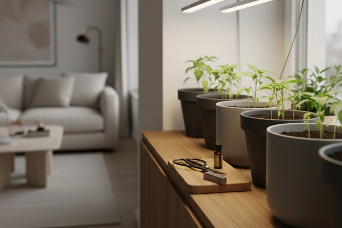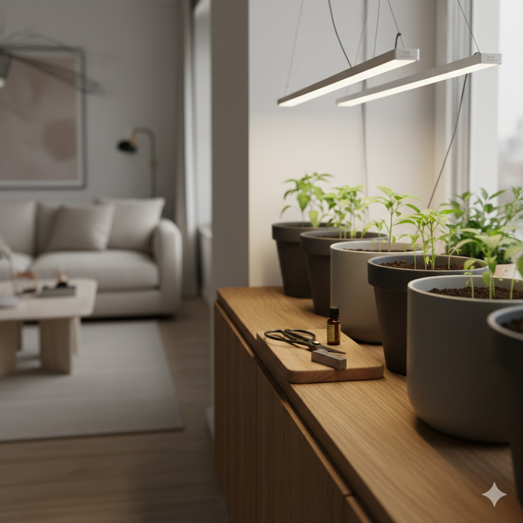 Pěstování v bytě může být i vizuálním zážitkem. Sáhněte po materiálech, jako je terakota v tlumených odstínech, beton nebo minimalistické samozavlažovací květináče. Domácí pěstování už nemusí být skryté v ústraní, ale může se stát přirozenou a vkusnou součástí vašeho obývacího pokoje.