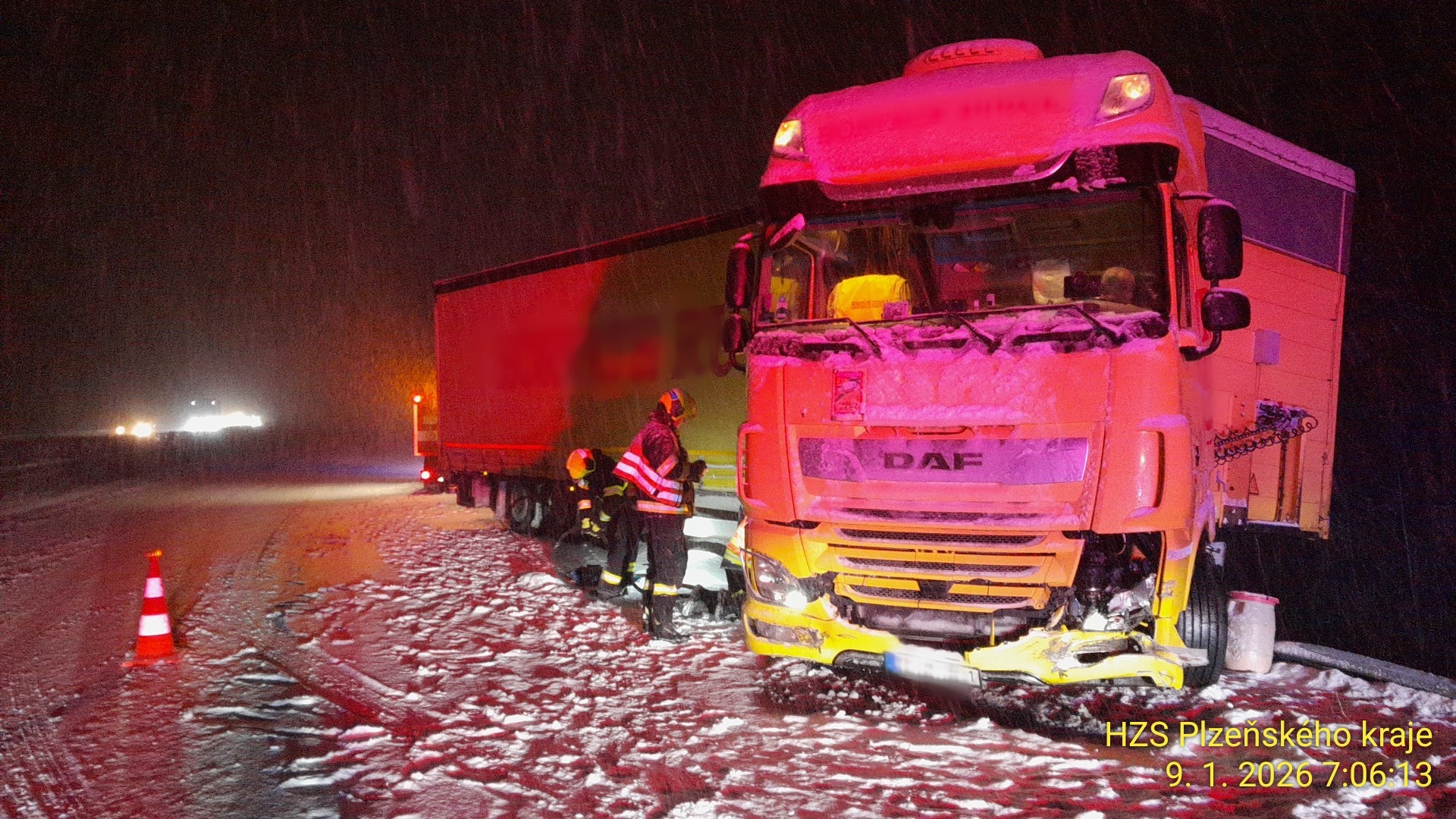 Sněžení komplikuje dopravu v Plzeňském kraji, na Klatovsku se srazilo auto se sanitkou, kamiony uvízlé po nočním sněžení v kopcích dnes ráno zastavily provoz na dálnici D5 na dvou místech na Tachovsku. Nejprve informovalo Národní dopravní informační centrum Ředitelství silnic a dálnic o uvízlých kamionech mezi 144. až 136. kilometrem na Tachovsku ve směru na Prahu. Následně oznámili policisté, že uvízlý kamion v kopci u Kladrub na Tachovsku zastavil provoz i na 112. kilometru D5 na Prahu.