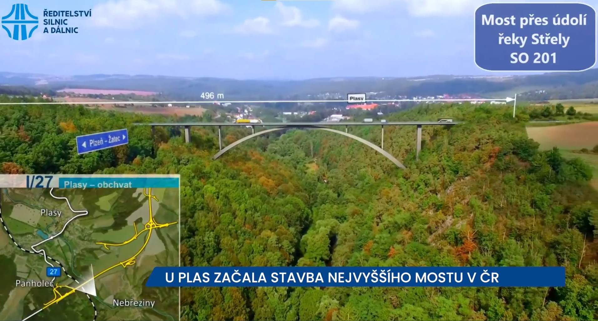 Miroslav Blabol, ředitel ŘSD Plzeňského kraje: “Ten most je unikátní tím, že to je nejvyšší most České republiky na silniční síti silnic první třídy, bude 87 metrů nad řekou Střelou, bude dlouhý 496 metrů a bude to obloukový most, rozpětí oblouků je 180 metrů a bude to obloukový most s horní mostovkou“