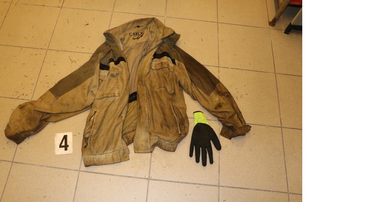 Na sobě měl černou mikinu s velkým portrétem vlka, v dolní části s nápisem FULL MOON PARTY, hnědou bundu na zádech s černým pruhem zn. Carletti, černé tepláky, pracovní obuv červeno černé barvy zn. Albartos, pracovní rukavice zn. DEK.
