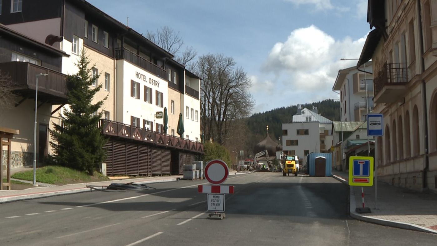 Železná Ruda, silnice I/27 v centru města. Tady začala další etapa opravy silničního průtahu s tím, že kolem městského úřadu neprojedete. Musíte to objet. „Na silnici 27 průtahu obcí Železná Ruda jsme započali třetí etapu této stavby, která by měla být dokončena v letošním roce, v druhé polovině letošního roku, zhruba v září, pokud vše půjde hladce. Stavba probíhá za částečné uzavírky provozu na silnici 27, jsou tam realizované objízdné trasy,“ řekl ředitel ŘSD Plzeňského kraje Miroslav Blabol.