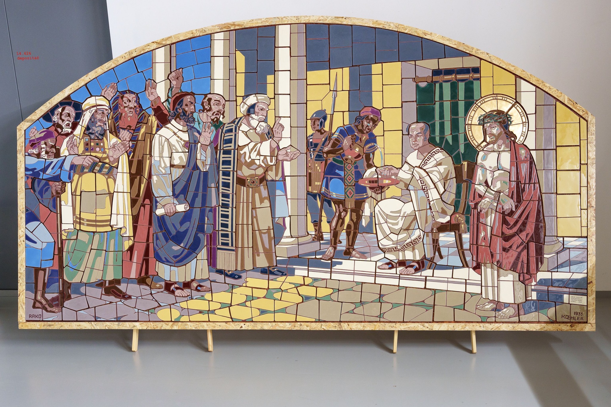 Výstava se tak soustředí právě na první zastavení křížové cesty s názvem Pilátův soud. Představuje historii ikonografického a kompozičního řešení námětu a proces vzniku mozaiky.