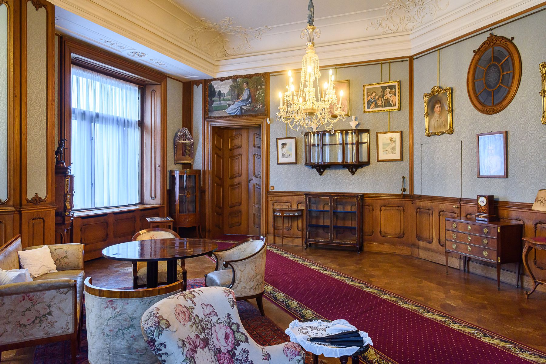 Původní tapety v Dámském salonu po odborném vyčistění, zafixování a zakrytí trhlin kompletně překryla nově utkaná replika látkové tapety.
